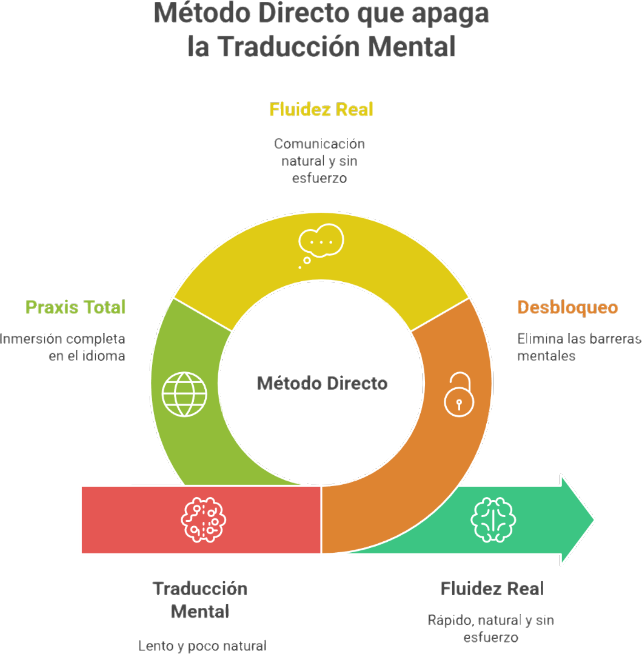 ➡️ No. Nuestro método es directo, situacional y libre de gramática. Su principal diferencia es que asocia el uso de la lengua materna al nuevo idioma, lo cual elimina la traducción mental que genera bloqueo. Está diseñado para entrenar al alumno en situaciones reales desde el primer día, no para saturarlo con teorías.